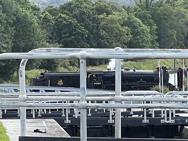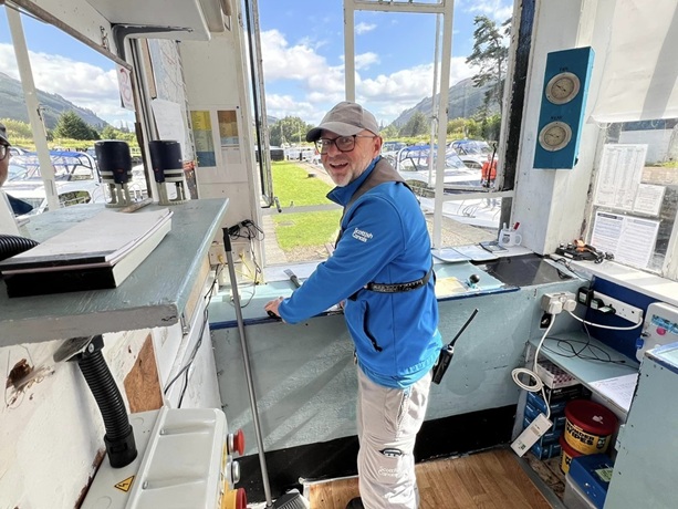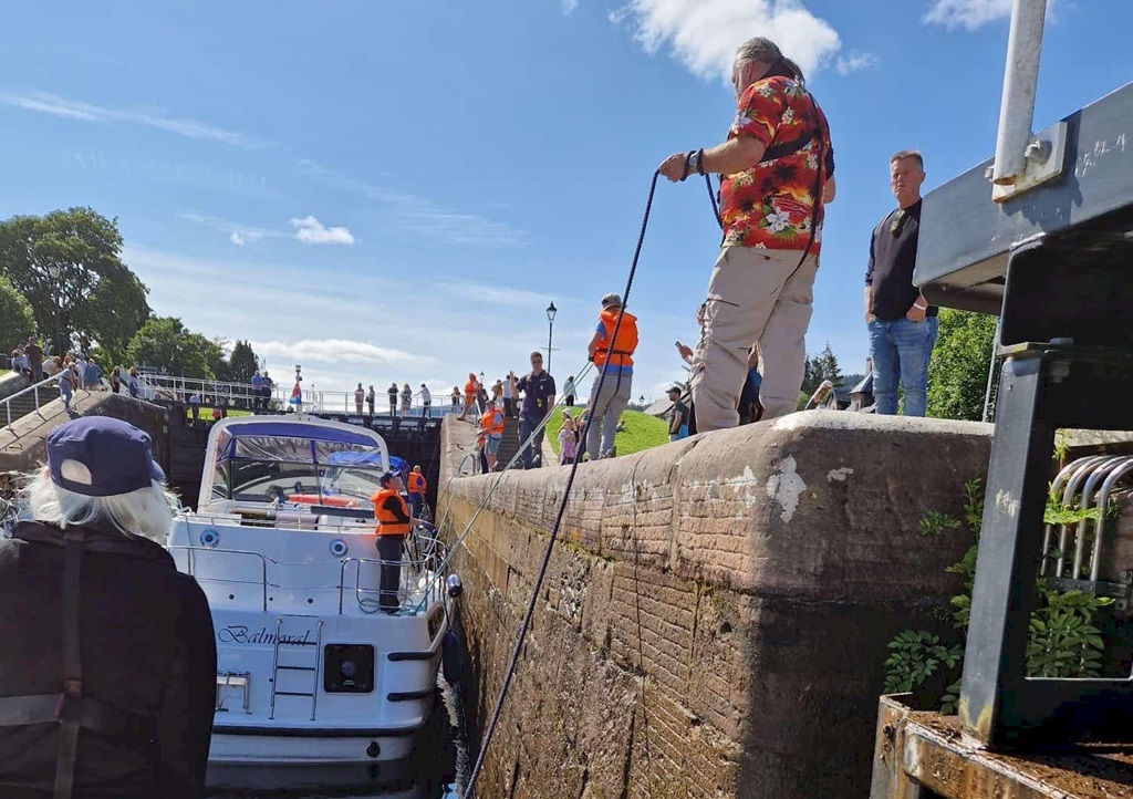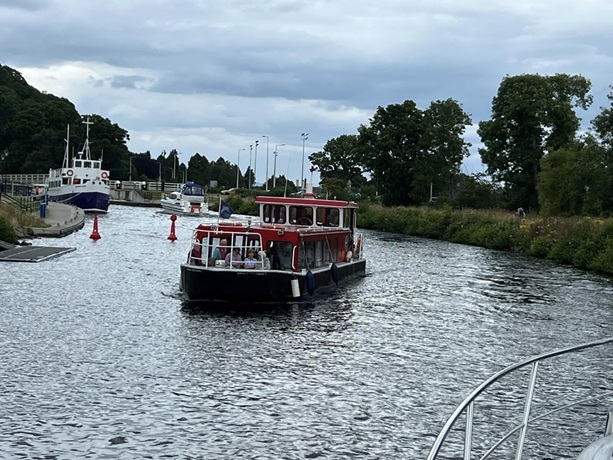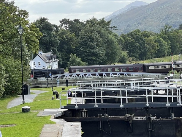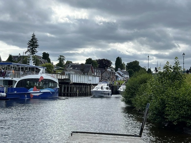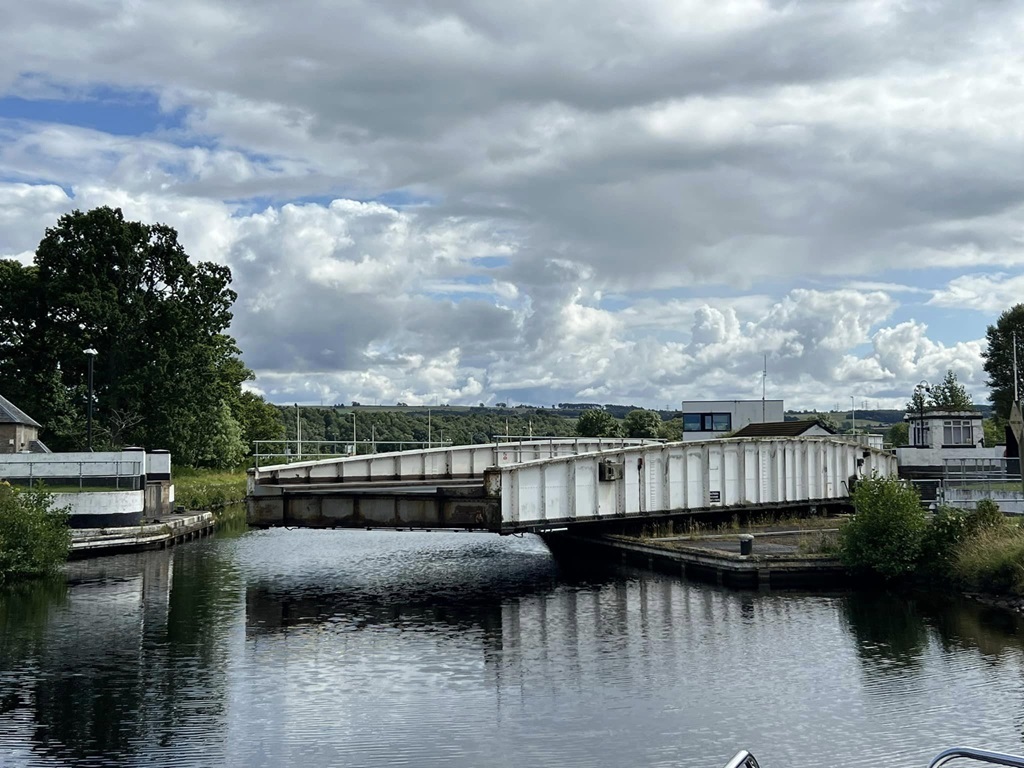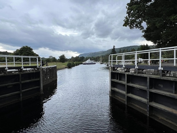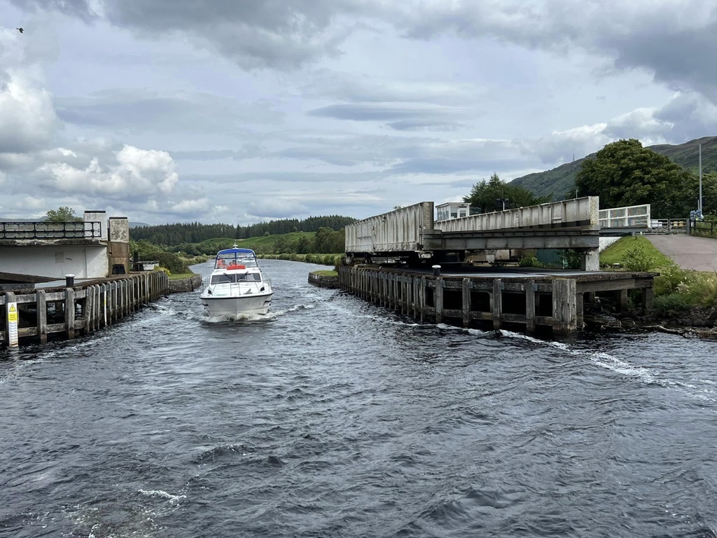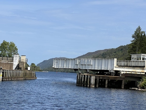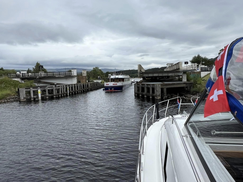 Unsere Route führte durch Loch Lochy. Die Landschaft mit ihren grünen Wäldern und sanften Hügeln war wieder beeindruckend. Bei der Ausfahrt aus Loch Lochy mussten wir kurz an der Drehbrücke warten und ein Passagierschiff passieren lassen.