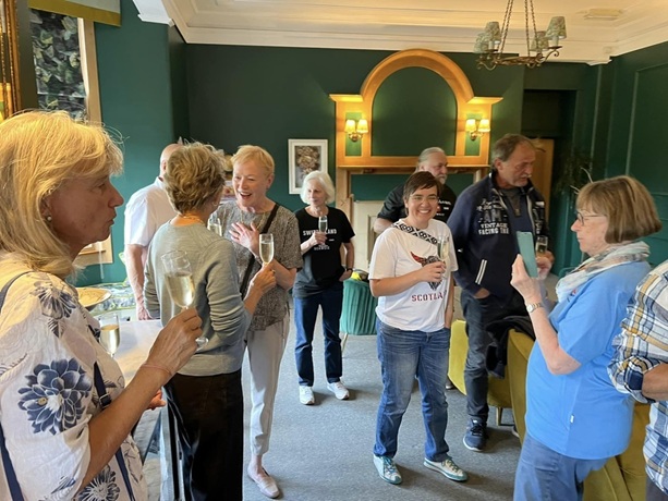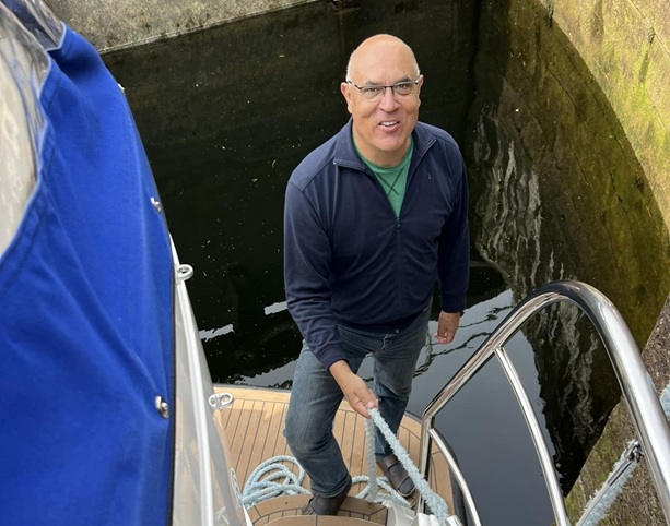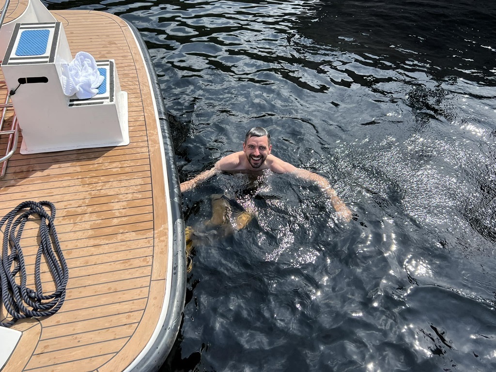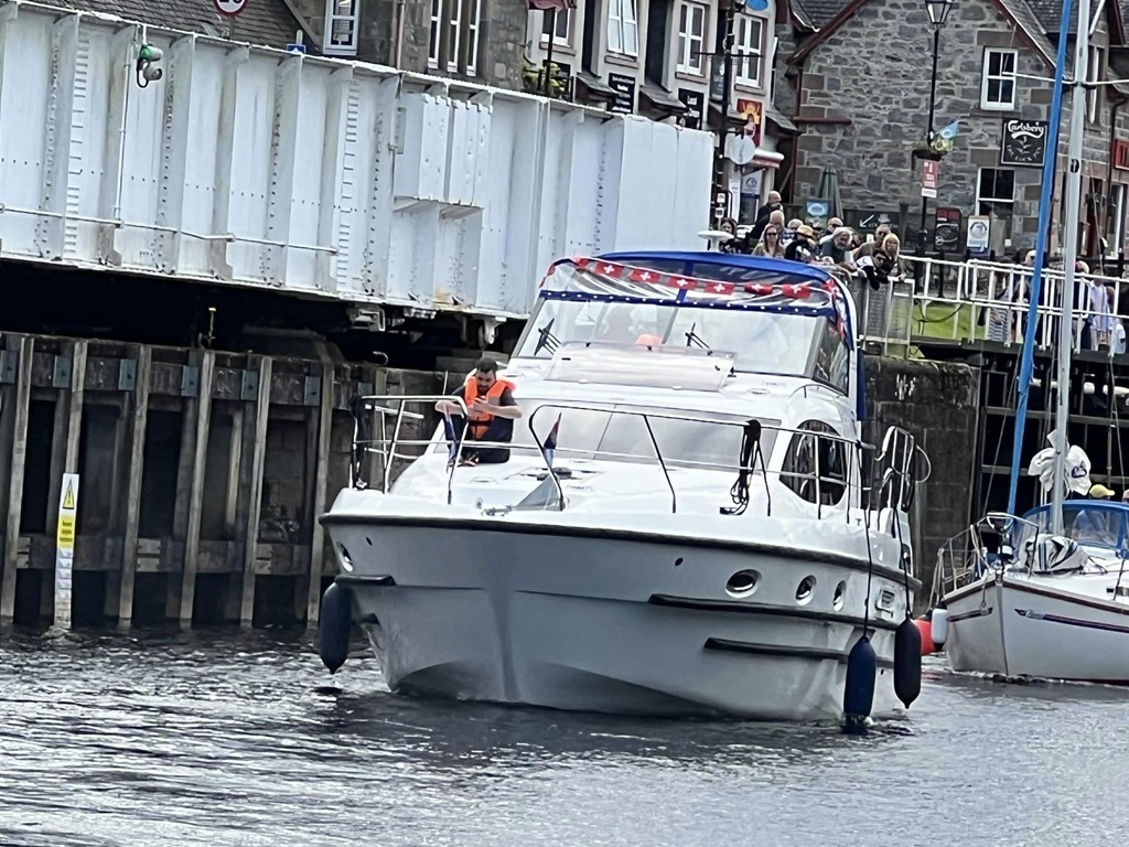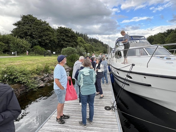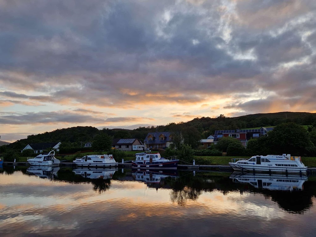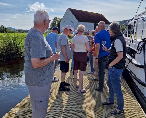 Zum Abschluss des Tages gab es auf dem Schwimmponton einen wunderbaren Anlegetrunk. Unser Apéro-Boot spielte Musik von Peter Reber, und wir genossen die entspannte Atmosphäre, während wir den Tag Revue passieren ließen. Insgesamt war es ein weiterer wundervoller Tag auf dem Caledonian Canal.