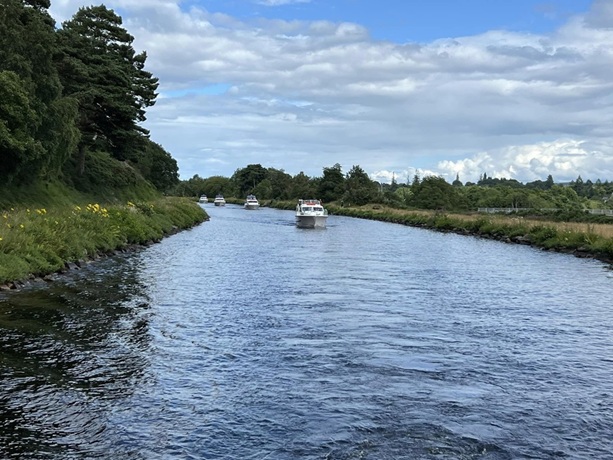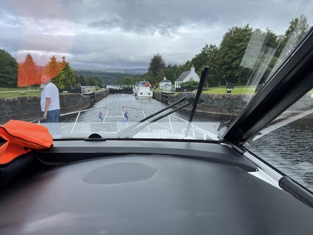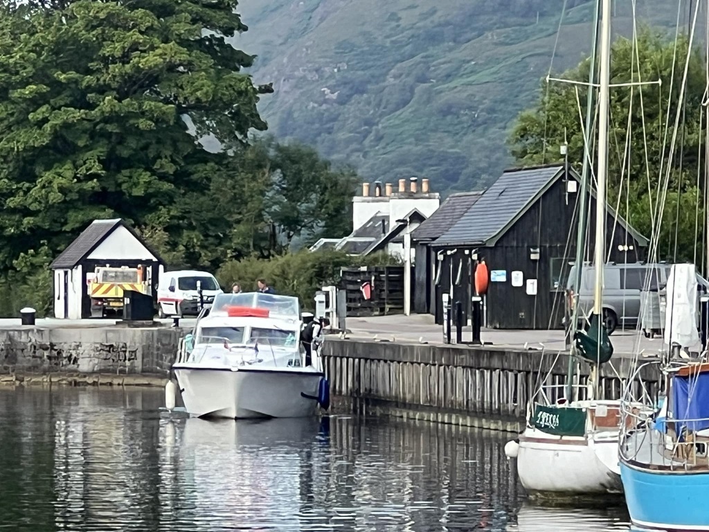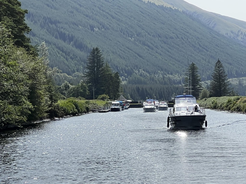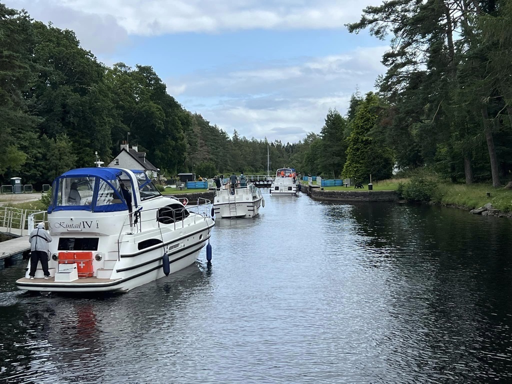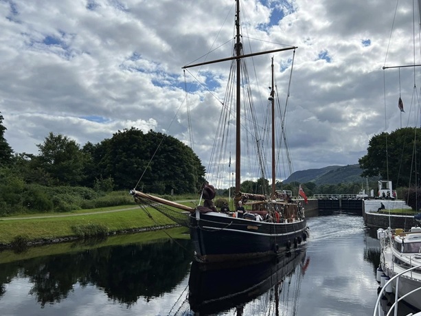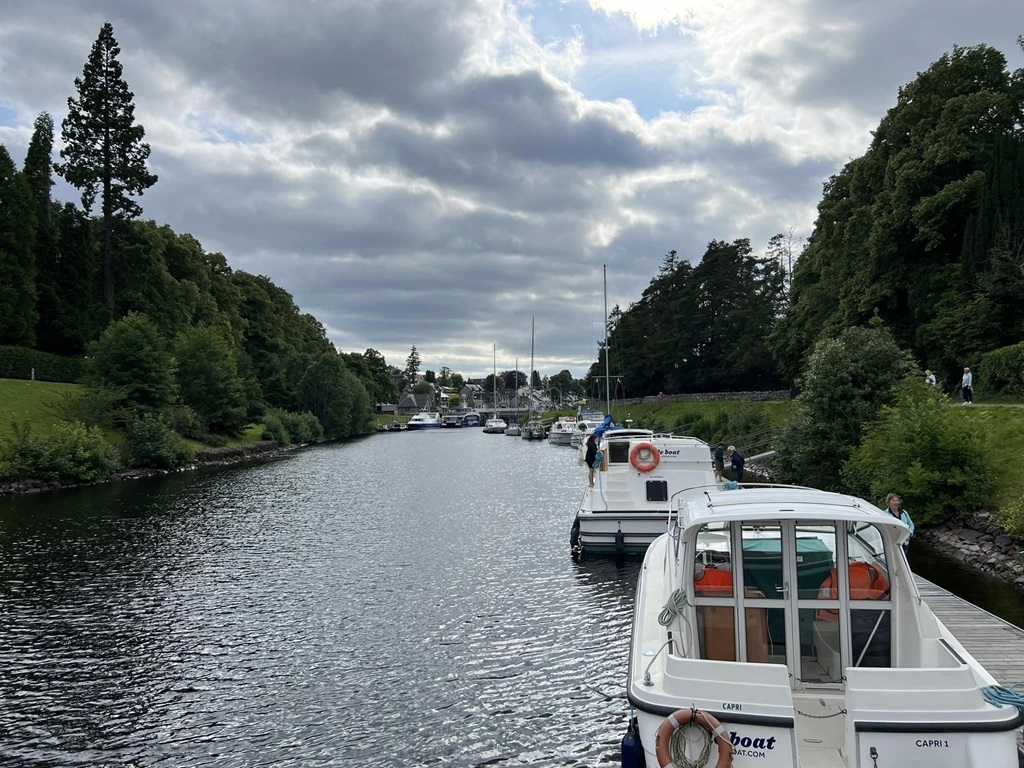 Heute haben wir den Hafen von Fort William verlassen. Unsere Reise führt uns nun wieder in Richtung Osten durch den Caledonian Canal nach Inverness. Der Morgen begann bei strahlendem Sonnenschein und einem perfekten Wetter für unsere Bootsfahrt. Unsere erste Herausforderung des Tages war die Drehbrücke bei Moy. Darauf folgte die erste Schleuse, Cairlochy Lock, hier ging es 5 m nach oben. Es war ein interessantes Erlebnis, besonders da wir mit einem Greenhorn die Schleuse passierten. Das sorgte für einige unterhaltsame Momente! Nach der Schleuse ging es weiter über den Loch Lochy. Dieser See ist etwa 16 Kilometer lang und an seiner tiefsten Stelle über 70 Meter tief. Zu beiden Seiten erheben sich Hügel, die ein schönes Panorama geben. Loch Lochy ist nicht nur landschaftlich reizvoll, sondern hat auch eine Fischzucht, die für ihre hochwertigen Forellen und Lachse bekannt sind. Am Ende von Loch Lochy erwartete uns die nächste Schleuse, die Laggan Locks. Hier genoss ein Mitglied unseres Schiffes ein erfrischendes Bad. Die Wassertemperatur lag bei etwa 14 Grad Celsius – nicht gerade warm, aber sehr erfrischend. Nach der Laggan Locks setzten wir unsere Fahrt durch den