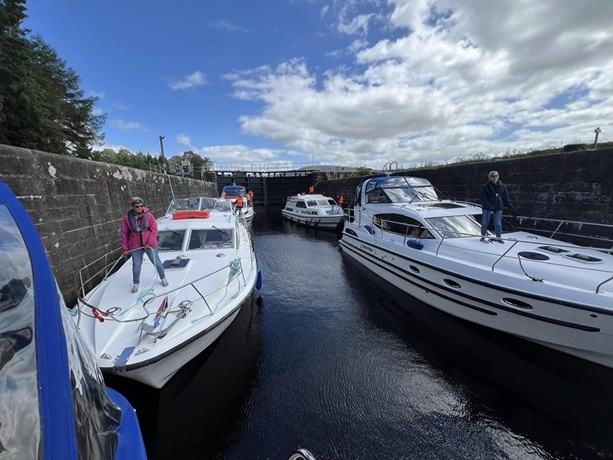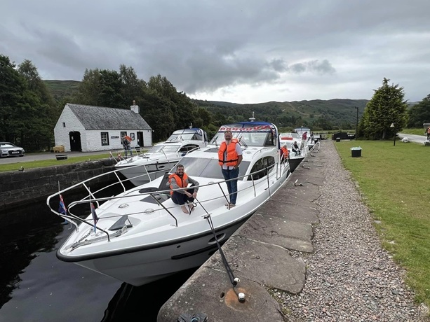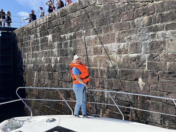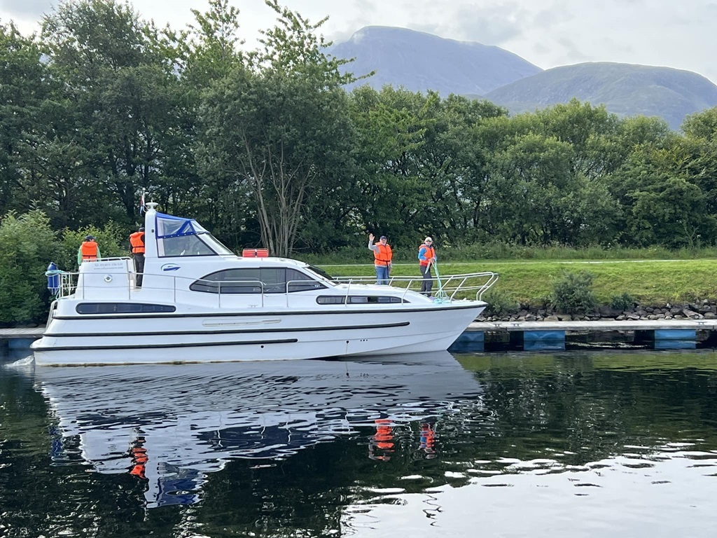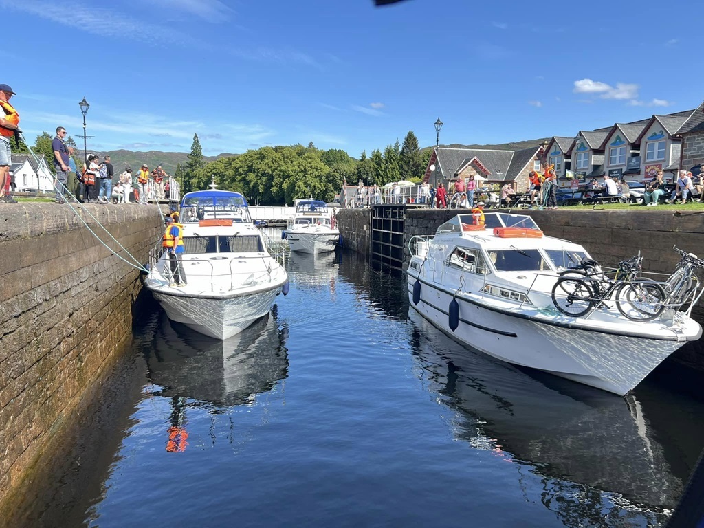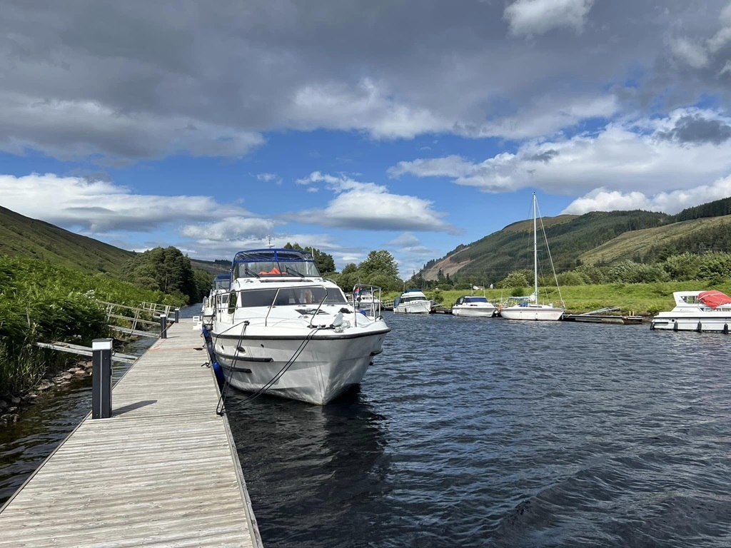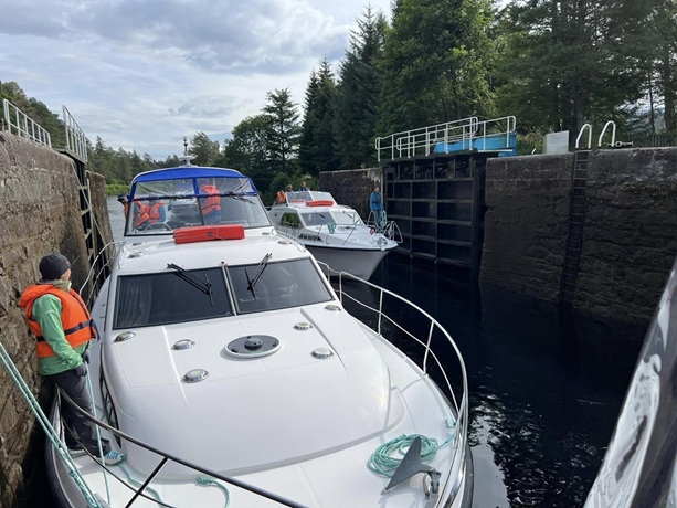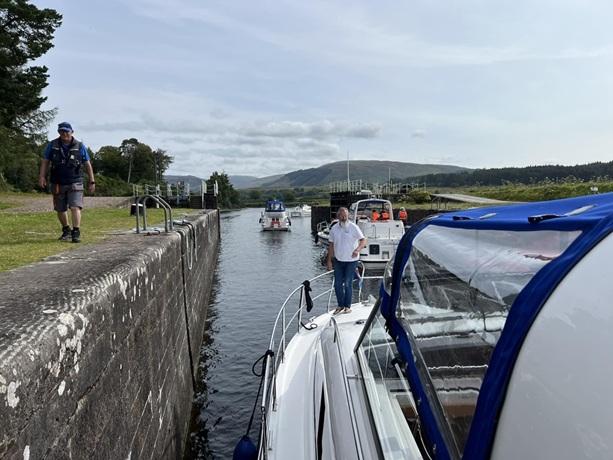 Heute haben wir den Hafen von Fort William verlassen. Unsere Reise führt uns nun wieder in Richtung Osten durch den Caledonian Canal nach Inverness. Der Morgen begann bei strahlendem Sonnenschein und einem perfekten Wetter für unsere Bootsfahrt. Unsere erste Herausforderung des Tages war die Drehbrücke bei Moy. Darauf folgte die erste Schleuse, Cairlochy Lock, hier ging es 5 m nach oben. Es war ein interessantes Erlebnis, besonders da wir mit einem Greenhorn die Schleuse passierten. Das sorgte für einige unterhaltsame Momente! Nach der Schleuse ging es weiter über den Loch Lochy. Dieser See ist etwa 16 Kilometer lang und an seiner tiefsten Stelle über 70 Meter tief. Zu beiden Seiten erheben sich Hügel, die ein schönes Panorama geben. Loch Lochy ist nicht nur landschaftlich reizvoll, sondern hat auch eine Fischzucht, die für ihre hochwertigen Forellen und Lachse bekannt sind. Am Ende von Loch Lochy erwartete uns die nächste Schleuse, die Laggan Locks. Hier genoss ein Mitglied unseres Schiffes ein erfrischendes Bad. Die Wassertemperatur lag bei etwa 14 Grad Celsius – nicht gerade warm, aber sehr erfrischend. Nach der Laggan Locks setzten wir unsere Fahrt durch den