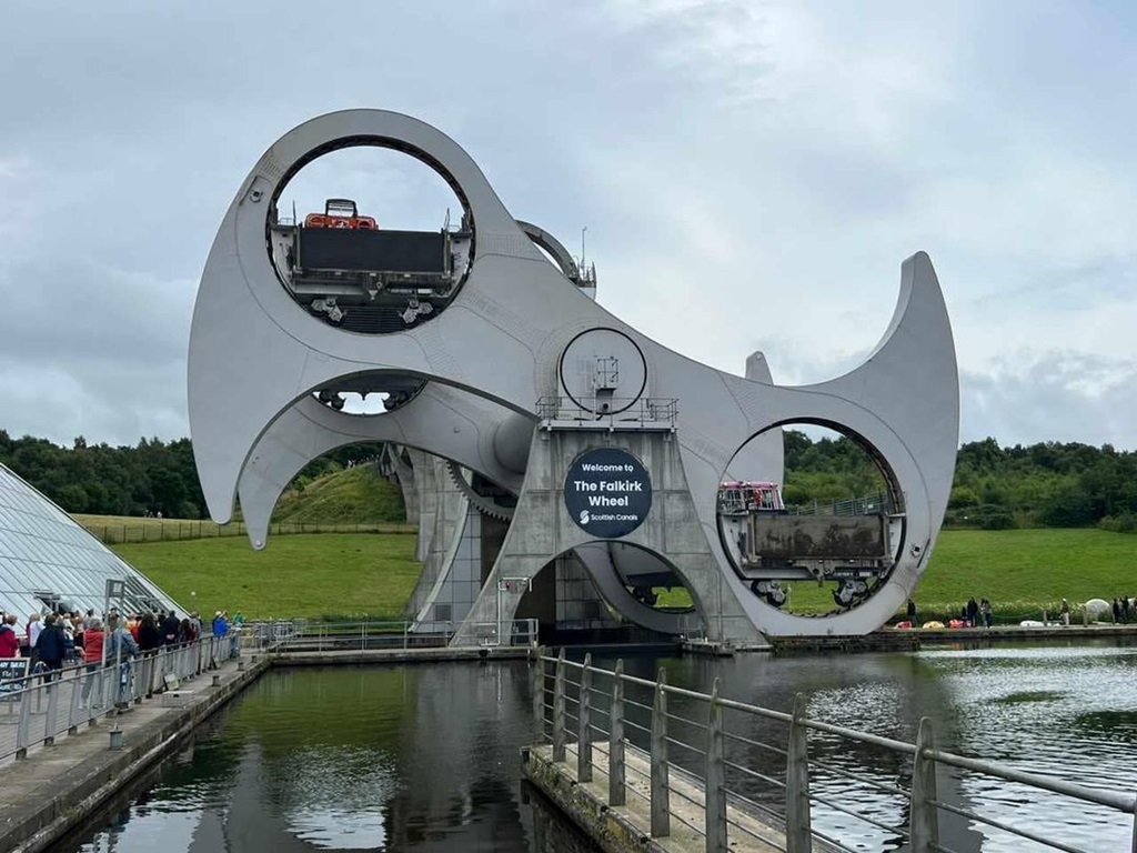 Wir machen einen Stopp beim Hebewerk Falkirk Wheel. Dieses riesige Stahlgebilde dient zum Heben von Schiffen und stellt dadurch eine Verbindung zwischen dem Fort-Clyde- und dem Union-Kanal her.