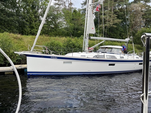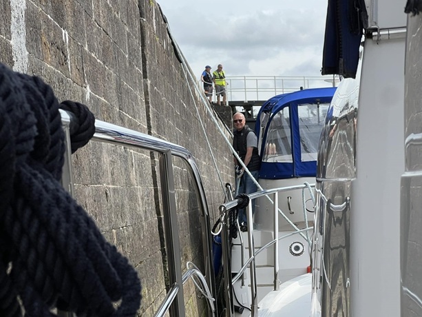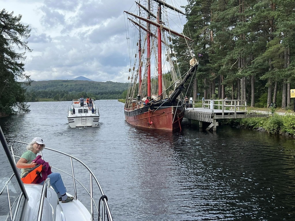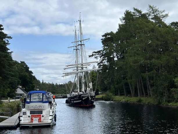 Das Highlight des heutigen Tages war aber sicher die Begegnung beim Kytra Lock mit einem Segelschiff der Royal Navy. Es war sehr beeindruckend als das grosse Marine Schiff an uns vorbei fuhr.
