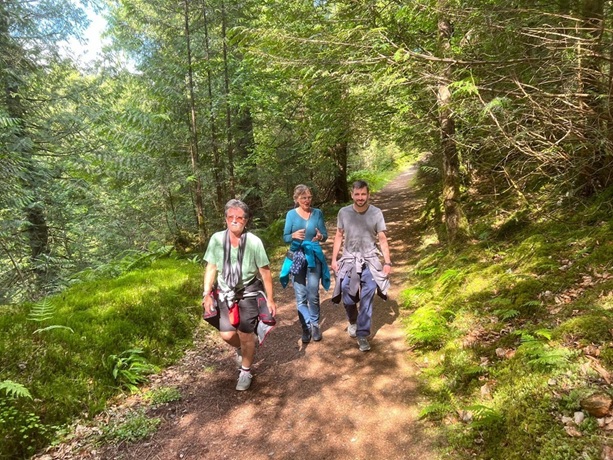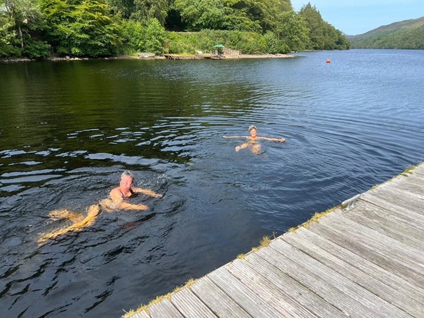 Kanal fort, der sich durch dichte Wälder schlängelt. Die nächste Drehbrücke, die wir passierten, war die Laggan Swing Bridge. Unser Ziel für den Tag war der Anfang von Loch Oich, wo wir an einem idyllischen Liegeplatz anlegten. Eines unserer Schiffe nützte die Gelegenheit und machte noch ein paar Anlegemanöver. Danach gab es für zwei Damen kein Halten mehr - ab ins erfrischende Wasser!