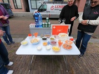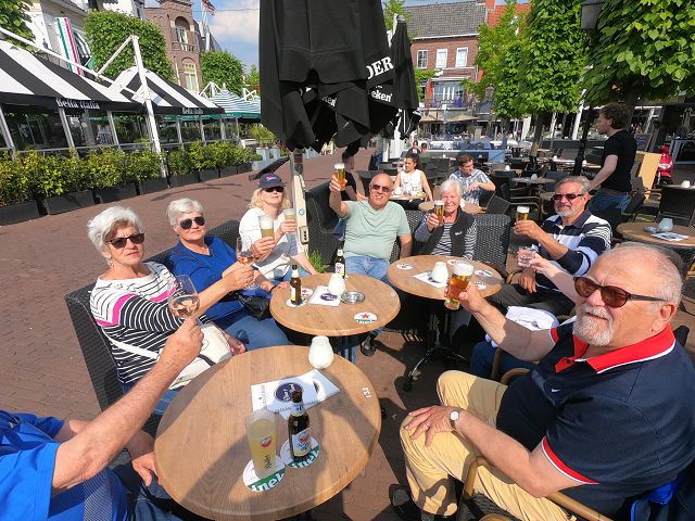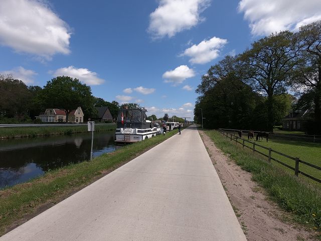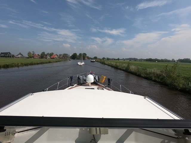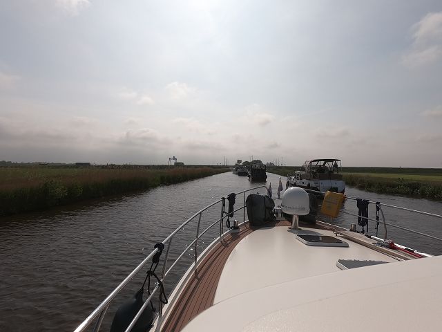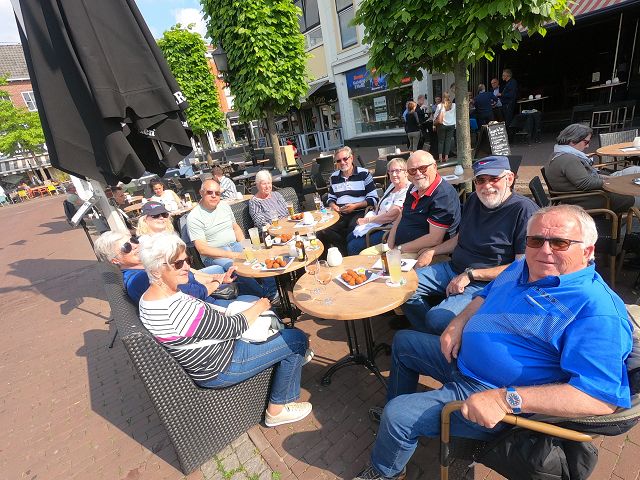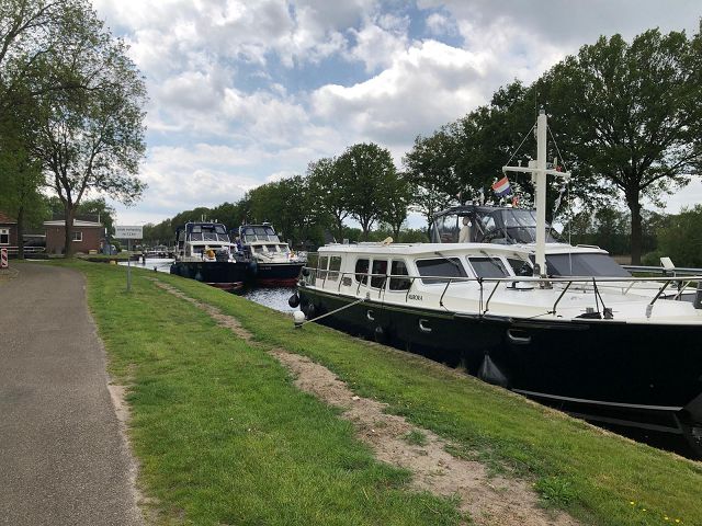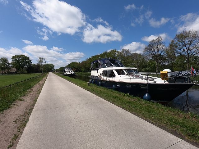 Ein strahlender Tag erwartet uns. Bereits am Morgen um sieben scheint die Sonne bei wolkenlosem Himmel. Die Nacht war eher kühl, so das die Schiffe richtig nass vom Tau sind. Auf allen Schiffen wird die Feuchte mit Putzwedel und Lappen von den Schiffen verbannt. Nach einem kleinen Frühstück, nach dem reichhaltigen Nachtessen beim Chinesen passt nicht so viel in den Bauch, fahren wir weiter in Richtung Assen. Bereits nach den ersten beiden Schleusen, werden wir zum Warten gezwungen. Der Brückenwärter ist irgendwo unterwegs, also liegen wir vor der Brücke, über die ganze Kanalbreite vertäut und warten, dass wir weiter fahren können. Nach einer Stunde erscheint der Brückenmeister und lässt uns vor dem Mittag noch zwei Brücken passieren. Danach ist für eine Stunde Mittagspausen. Am Nachmittag läuft es aber "wie s' Bisiwätter" und im nu sind wir vor der Autobahnbrücke bei Assen. Nun heisst es die Schiffhöhe auf 3.5 Meter zu verringern, damit wir den Liegeplatz in der Stadt anfahren können. Den Anlegeapero gibt es heute im Restaurant, mit Bitterballen! Das Wetter bleibt den ganzen Tag super schön und warm.