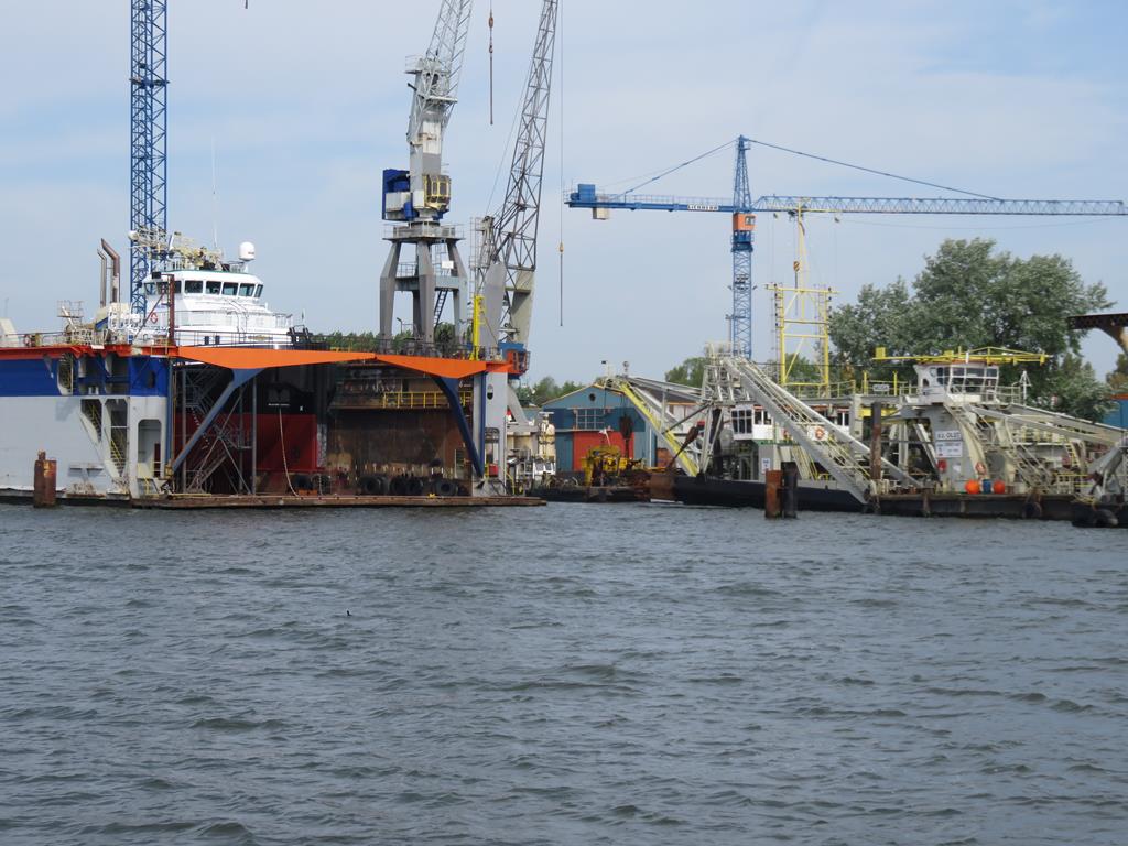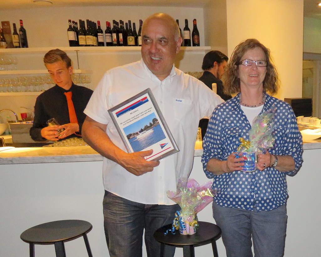 Mit Vollgas, die Taxis haben offenbar nur zwei Möglichkeiten für die Geschwindigkeit, hüpfen wir über die Wellen der Berufsschiffe. Nach ca. 12 Minuten erreichen wir, komplett durchgeschüttelt, den Zielort. Die Hafenrundfahrt führt uns zuerst am rechten Ufer entlang zu Tal. Es ist sehr eindrücklich, die Aktivitäten im grössten Hafen in Europa direkt mit zu erleben. Das Sido Schiff biegt in die Hafenbucht, wo die Hochseeschiffe, welche Seekabel verlegen und andere Arbeitsschiffe gewartet werden, ein. Sehr interessant, dies aus der Nähe anzuschauen. Nach der Rückkehr können allen den Tag nach eigenen wünschen gestalten. Nächster Fixpunkt ist das "Kapitänsdinner", welches im Restaurant des Euromasten stattfindet. Ein nicht zu toppender Ort, um die Aussicht über die Stadt und den Hafen zu geniessen. Das Nachtessen mit den 5 Gängen und dazwischen die Fahrt mit der drehbaren Aussichtsplattform zur Spitze des Turmes, war fantastisch! Peter und Elisabeth werden noch mit Glückwünschen und einem kleinen Präsent als neue Eigner ihrer Zattera überrascht. Die Heimfahrt zu unseren Schiffen mit den Wassertaxi klappt wieder ausgezeichnet, so dass wir kurze Zeit später auf unseren Schiffen sind.